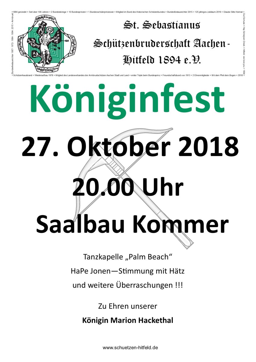 Hiermit sind alle Schützen und Freunde der Schützen sowie alle anderen zu unserem diesjährigen Königinfest 2018 im Saalbau Kommer eingeladen.